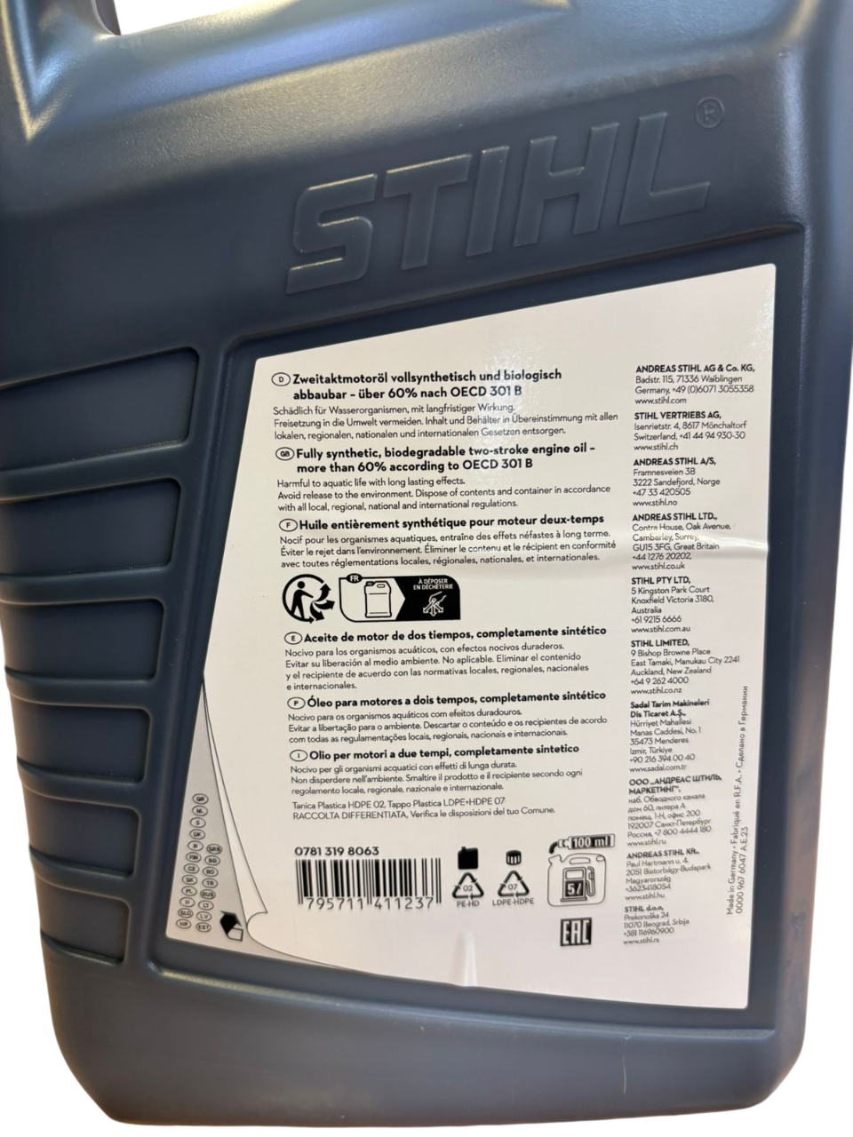 Синтетическое масло для длительного использования при высоких нагрузках. Почти безостаточное сгорание, способность к биологическому разложению (более 60 % по OECD 301 B), особенно низкое содержание серы, JASOFB, ISO-L-EGB, соотношение компонентов смеси 1:50, подходит для 2-тактных двигателей, STIHL 2-MIX и 4-MIX.